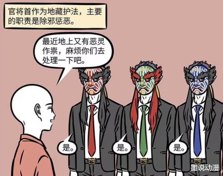 《非人哉》漫画版中,地府已经登场9个角色,分别是地藏菩萨、谛听、黑白无常、牛头马面、孟婆、官将首(增损二将)。地藏菩萨救苦救难,谛听是白泽的小迷弟,孟婆则是雷厉风行。