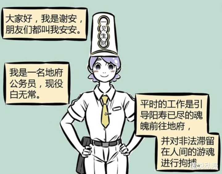 白无常在这个时代,已经不止一个人,而是一个职务。不过白无常之中,最具代表性的人物,是谢安,原型是谢必安。谢安从小就羡慕白无常们的工作,特别是喜欢他们的工作制服。在经过多次努力之后,谢安总算考取地府的公务员,成为白无常的一员。谢安跟九月的关系很好,平时也会聚在一起喝酒吃串,聊人生。