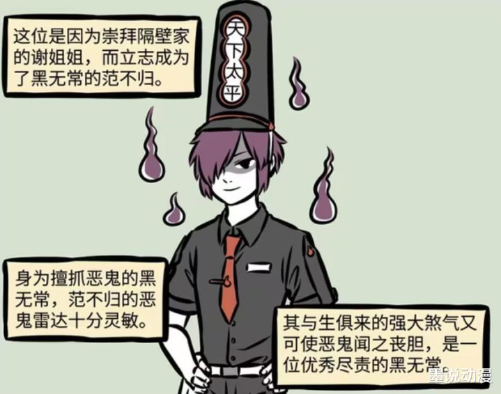 黑无常和白无常一样,都是地府公务员的一个职位。黑无常之中,最具代表性人物的人就是范不归,也就是以范无咎作为原型。范不归从小就崇拜谢安,成为黑无常之后,也跟谢安组队。平时嫉恶如仇,恶鬼在他面前无所遁形,九月还被他抓过。